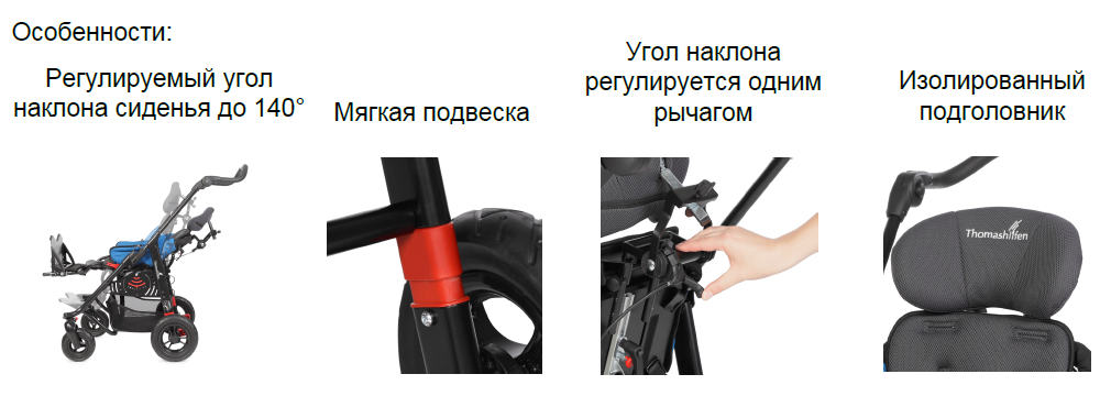 Мягкая подвеска на раме поглощает вибрацию и обеспечивает комфортный плавный ход коляски. Растет вместе с пользователем за счет множества регулировок (регулировка ширины, сиденья, глубины сиденья, высоты спинки, высоты подножки). Четыре звездообразные рукоятки под сиденьем позволяют выполнять регулировки без каких-либо инструментов - даже если ребенок находится в коляске. Регулировка угла наклона и высоты подножки, возможность складывания и использования с ремешком для фиксации ног. Центральный рычаг позволяет изменять угол наклона сиденья или отсоединить сиденье от шасси одной рукой.